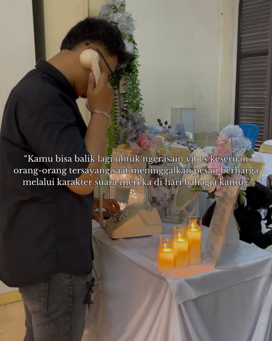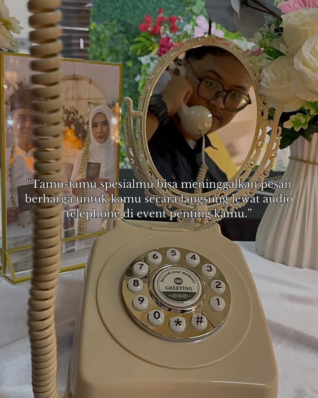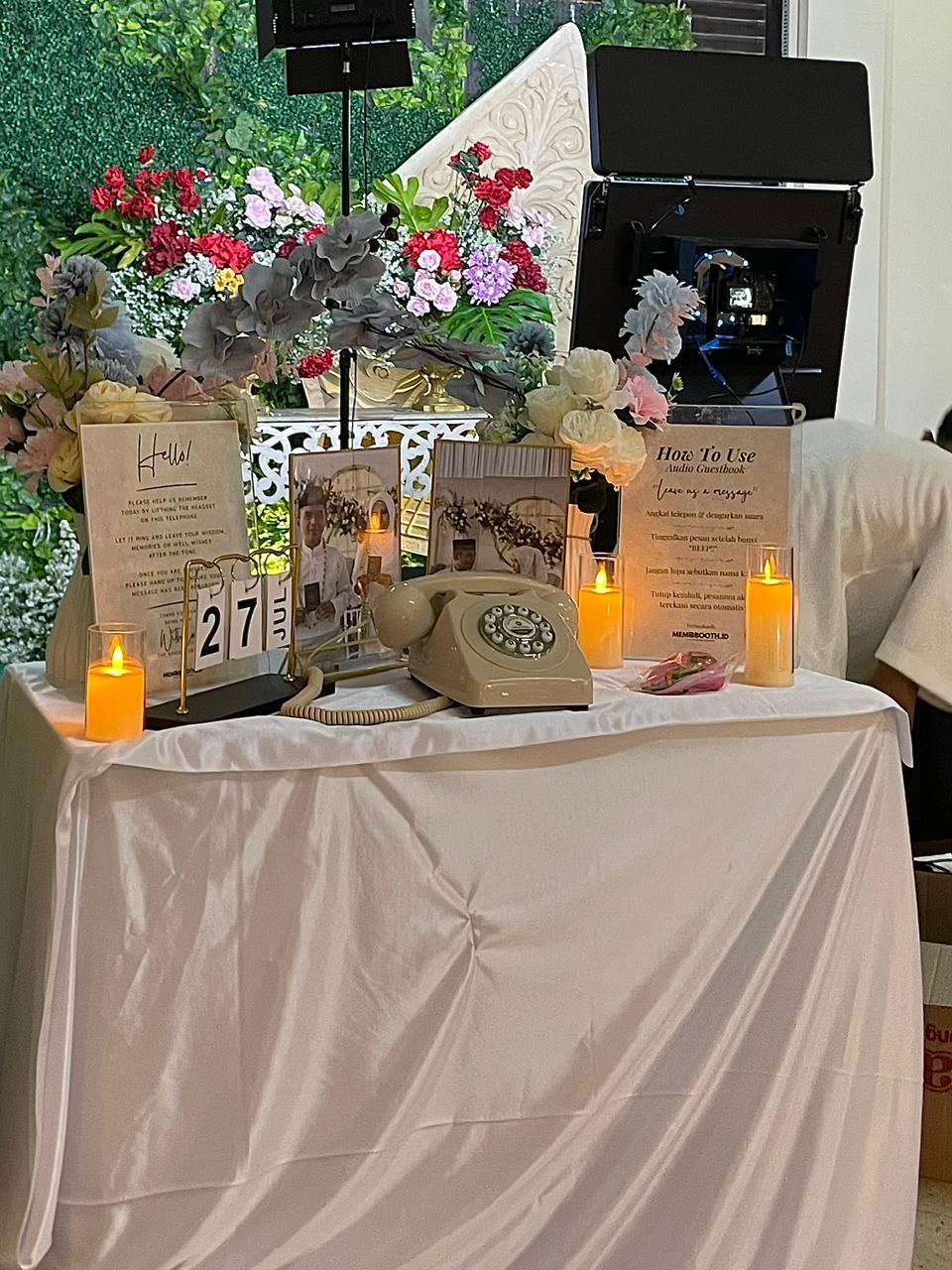 Audio Guestbook dari Memobooth adalah cara baru dan lebih personal untuk mengabadikan ucapan tamu. Tamu cukup mengangkat handset klasik dan menyampaikan pesan, doa, atau cerita secara langsung. Hasil rekaman akan dikumpulkan dalam satu file yang bisa kamu simpan sebagai kenang-kenangan seumur hidup. Sangat tepat untuk wedding, birthday, atau intimate event yang ingin menyimpan memori dalam bentuk suara yang penuh emosi.
